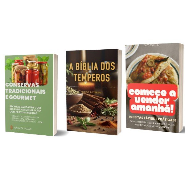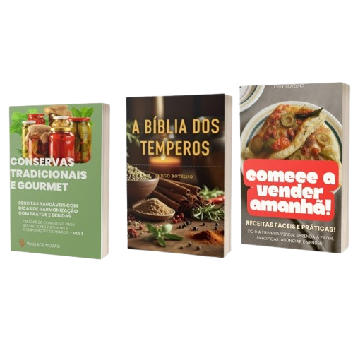 Neste kit exclusivo, reunimos as melhores receitas testadas e aprovadas de conservas artesanais e temperos e muito mais — com ingredientes acessíveis, técnicas simples e um toque gourmet que vai elevar o nível das suas entradas, acompanhamentos e até pratos principais.